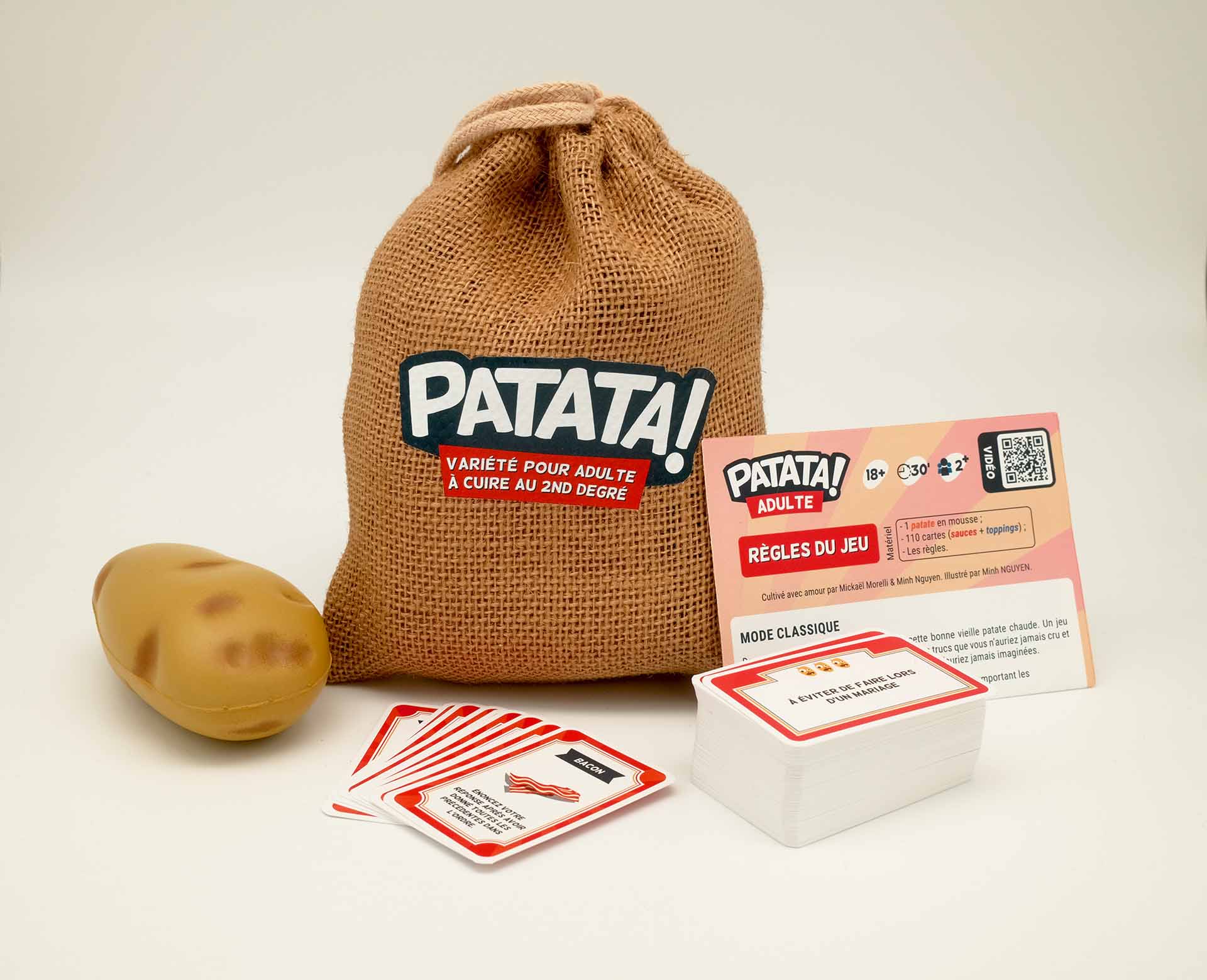 Patata c’est un jeu d’ambiance inspiré de la patate chaude, avec des règles simples et donc parfait pour des soirées conviviales entre amis ou en famille. C’est un peu le genre de jeu où tout le monde essaie de placer sa blague à chaque réponse, donc beaucoup beaucoup beaucoup de fous rires… Ça peut aussi aider un groupe à se connaître, rigoler ensemble et créer des liens. En plus, le design est super sympa et quali pour le prix – donc pour un cadeau c’est top – Foncez sans hésiter !